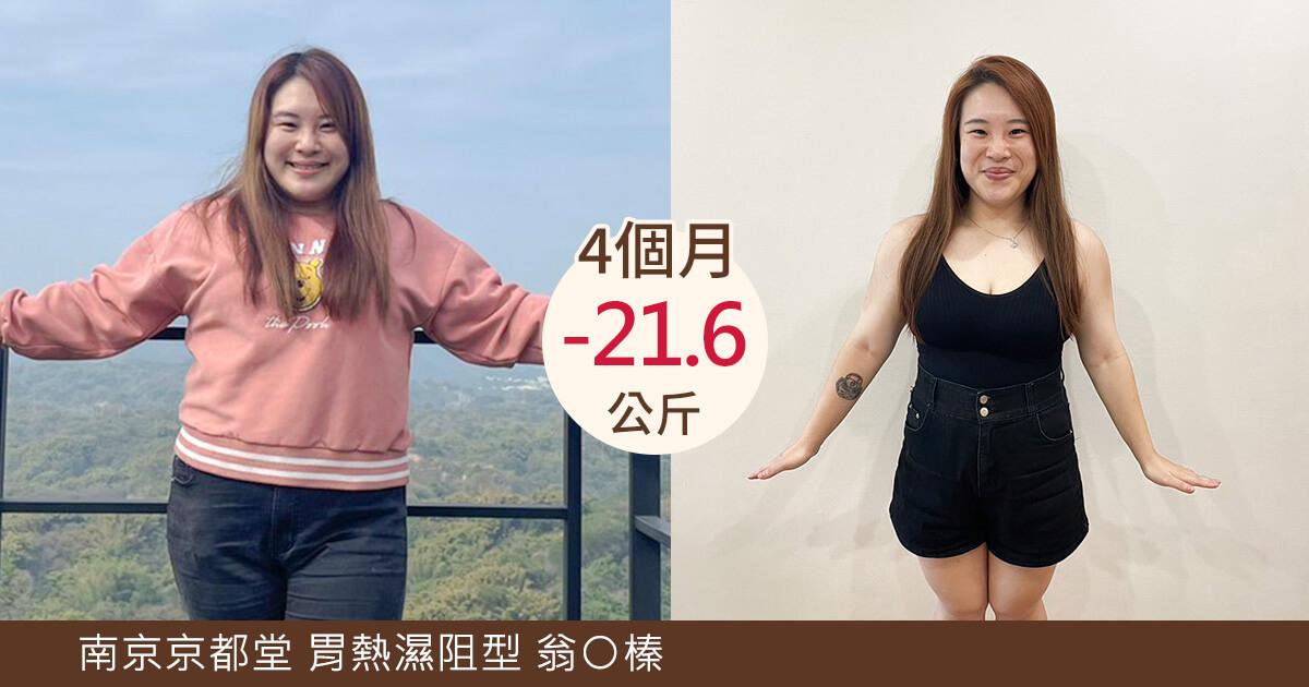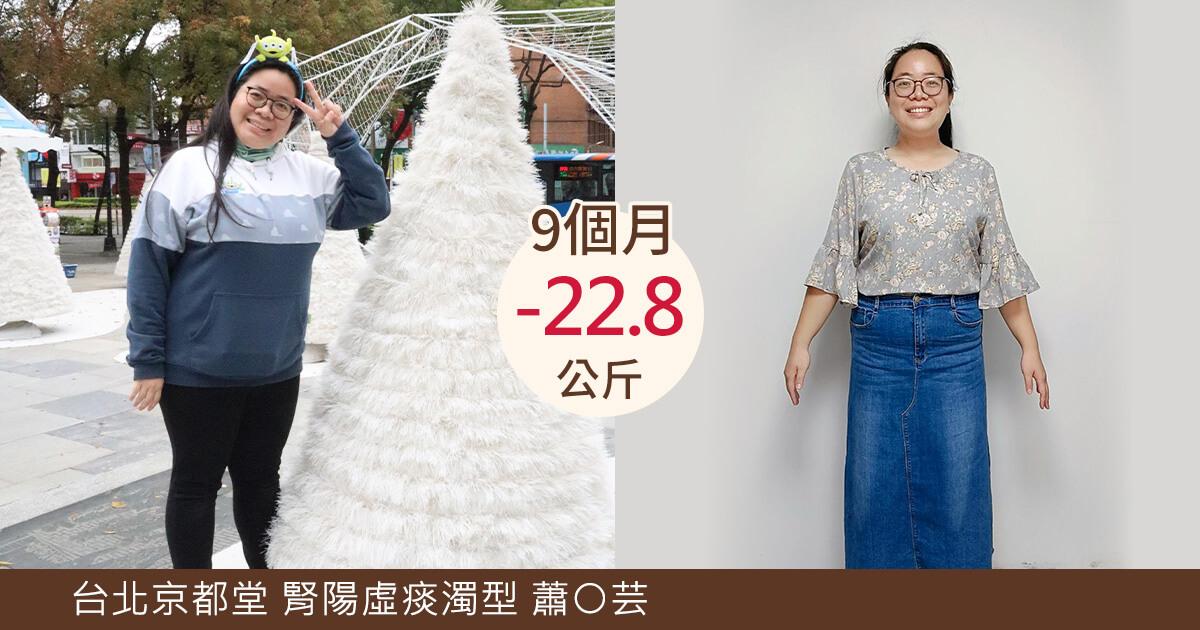 從事忙碌的美髮工作,作息不規律、三餐以外食為主,下班後常小酌犒賞自己,使體重一路攀升至75.2公斤、體脂39.8%。她在京都堂中醫選擇透過「五型體質檢測」+純中藥調理療程(無埋線體雕)進行體質改善與減重。2個月後,體重下降到 63.4 公斤(-11.8 公斤),體脂則下降至34.1%(-5.7%)。她分享自己水腫明顯改善、精神變得更好,也重新找回穿衣與拍照的自信。