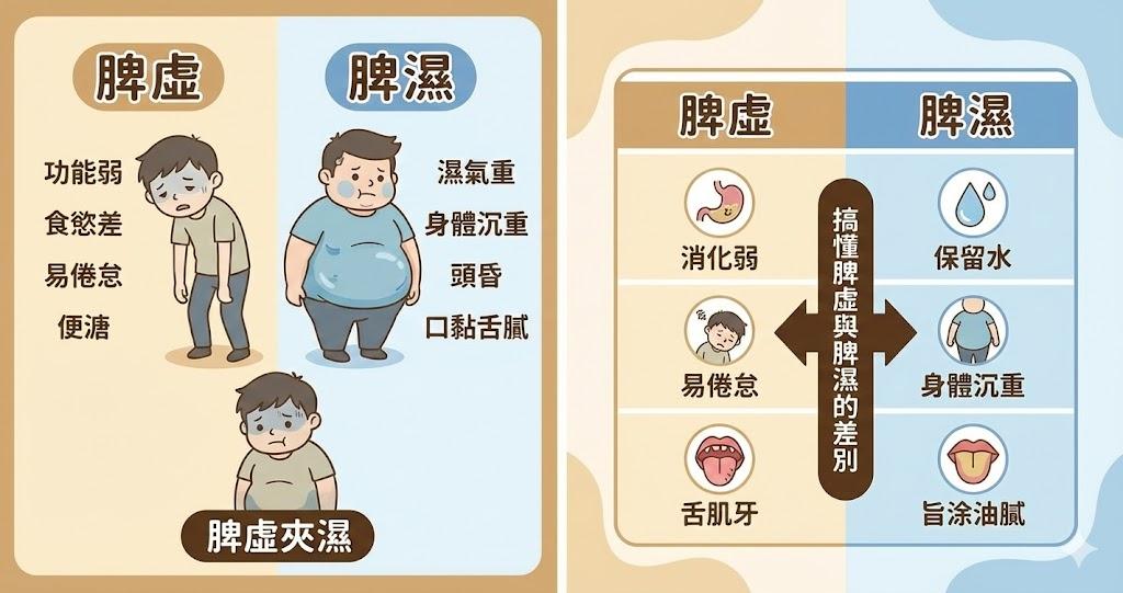 | 常見表現 | 食慾差、易倦怠、便溏 | 身體沉重、頭昏、口黏舌膩 |